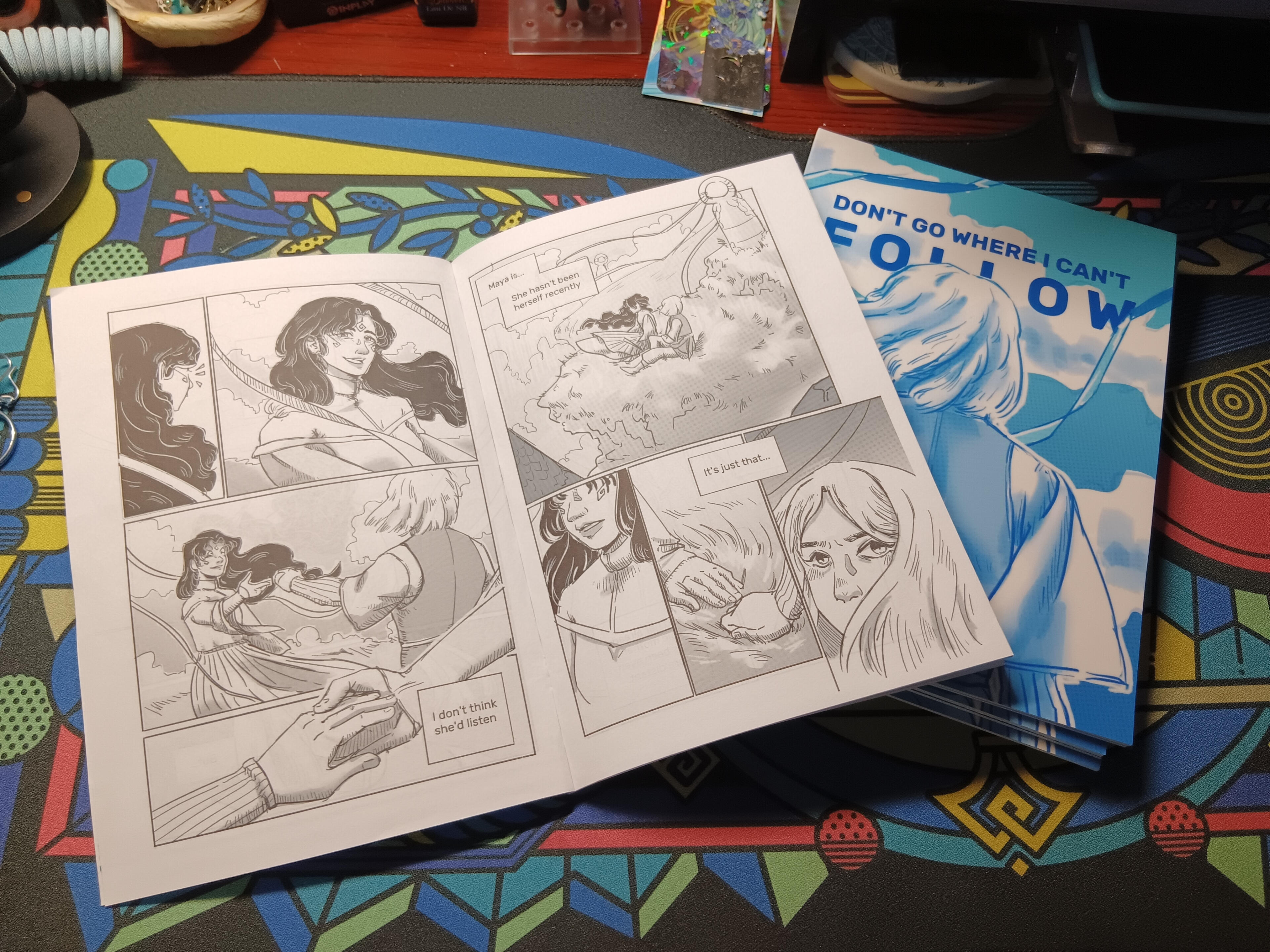 "There's something Adela needs to tell Maya. Will she be able to say what she truly feels before it's too late?"Don't Go Where I Can't Follow is a story set in a floating island in the sky and follows Adela as she sorts out her feelings and tries to muster up the courage to speak the words she's been too scared to say.This is a bite-sized story about love, longing, and the fear of losing those you love. It is also very very sapphic. Please take note.